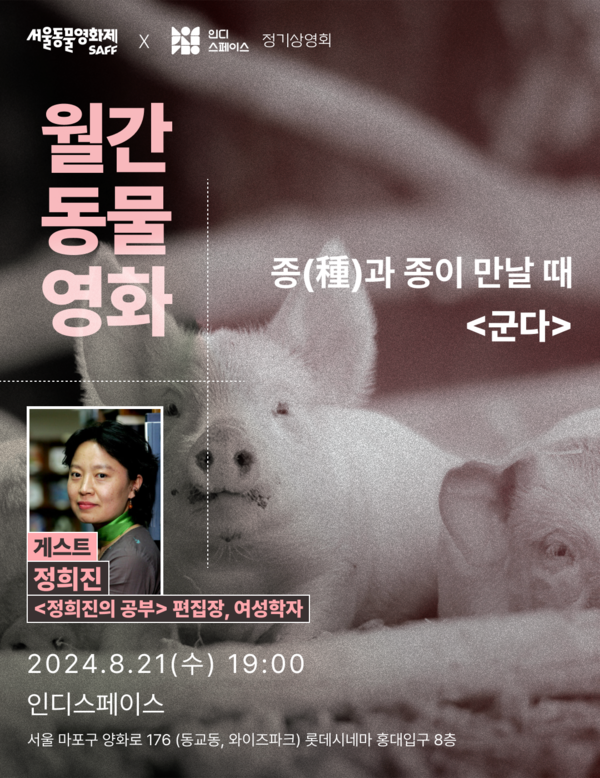 서울동물영화제(주최 동물권행동 카라)와 독립영화전용관 인디스테이스가 2024년 월간 동물영화 마지막 상영회를 개최한다고 7일 밝혔다.서울동물영화제와 인디스페이스는 8월 21일, 인디스페이스에서 ‘군다’(2020) 상영 후 정희진 편집장, 여성학자와 함께하는 인디토크가 진행된다고 밝혔다. 인디토크에서는 정희진 편집장과 관객들이 ‘종(種)과 종이 만날 때’라는 주제로 이야기를 나눈다.영화 ‘군다’는 제4회 서울동물영화제(구 카라동물영화제) 개막작으로, 거장 다큐멘터리 감독 빅토르 코사코프스키가 연출하고 배우이자 동물권