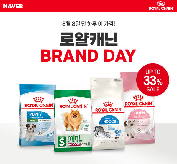 펫푸드 브랜드 로얄캐닌코리아가 8월 8일 ‘세계 고양이의 날’을 맞아 올해 마지막 네이버 브랜드데이 및 쇼핑 라이브를 진행한다.로얄캐닌은 브랜드데이가 진행되는 8월 8일 하루 동안 반려묘·반려견 성장기 맞춤 영양 사료를 최대 33% 할인된 가격으로 판매하며, 행사 당일 사료를 구매한 선착순 1,000명에게는 소용량 포장된 사료를 추가혜택으로 증정한다. 쇼핑 라이브에서는 라이브 한정 프로모션도 만나볼 수 있다. 방송 중 구매 고객에게는 최대 35% 할인 혜택과 함께 습식 사료 4종 증정 또는 구매 옵션에 따라 반려묘 이동장을 추가로