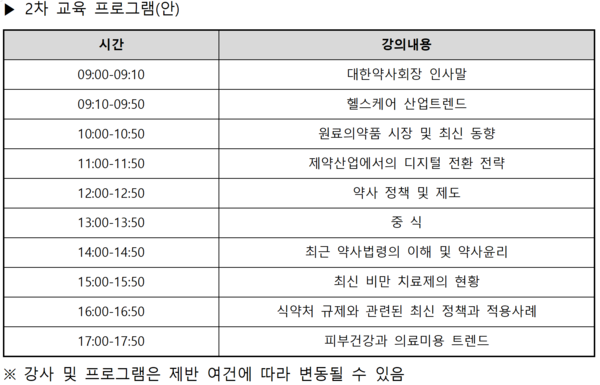 대한약사회(회장 권영희) 산업유통위원회는 오는 7월 25일에 세종대학교 광개토관 컨벤션홀에서 「2025년도 제2차 의약품 제조ㆍ수입업체 관리약사 연수교육」을 개최한다고 밝혔다.이번에 열리는 2차 연수교육은 의약품 제조, 품질, 안전, 수입 관리 업무에 등록된 관리약사로 지난 1차 교육을 받지 못한 약사 대상이다. 총 8시간 8평점으로 구성해, 교육을 수강할 경우 올해 연수교육을 모두 이수하게 된다.교육을 희망하는 제조·수입업체 관리약사는 7월 7일(월)부터~7월 11일(금)까지 대한약사회 및 산업유통위원회 홈페이지 배너를 통해 신청