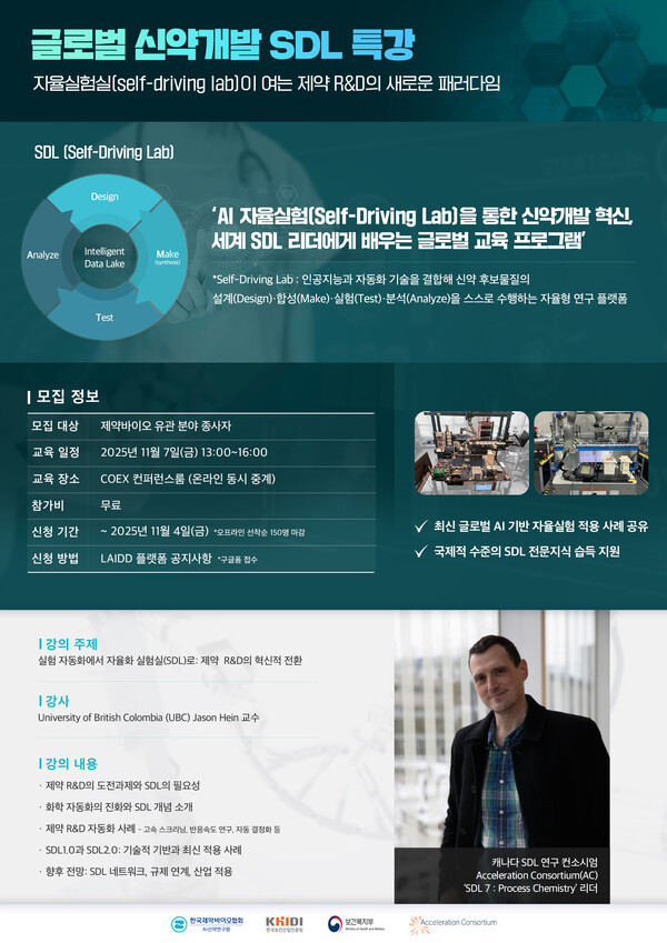한국제약바이오협회(회장 노연홍) AI신약연구원(원장 표준희)은 오는 11월 7일(목) 오후 1시부터 4시까지 서울 코엑스 컨퍼런스룸에서 '글로벌 SDL 석학 특강'을 개최한다고 31일 밝혔다. 이번 특강은 보건복지부와 한국보건산업진흥원의 '인공지능(AI) 활용 신약개발 교육 및 홍보(2차 추경)' 사업의 일환으로 마련됐다. 이번 행사는 AI 기반 신약개발 자율실험실(Self-Driving Lab, 이하 SDL) 분야의 세계적 석학인 캐나다 브리티시컬럼비아대(University of British Columbia, UBC) 제이슨 하