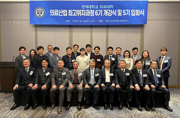 연세대학교 의과대학이 ‘의료산업 최고위자과정 6기’ 개강식을 성공적으로 개최했다.지난 16일 그랜드 인터컨티넨탈 서울 파르나스에서 열린 개강식에는 6기 교육생을 비롯해 이전 기수 수료생들, 대학 및 병원 교직원 등 40여 명이 참석했다.행사는 구성욱 강남세브란스병원장 겸 연세의대 의료기기산업학과 주임교수의 개회사로 시작됐다. 이어 김영민 한국의료기기산업협회장과 강대원 의료산업 최고위자과정 총동문회 신임회장(메디라인액티브코리아 대표)이 축사를 전했으며, 구성욱 병원장이 ‘미래 의학의 방향’을 주제로 특강을 진행해 큰 호응을 얻었다.만