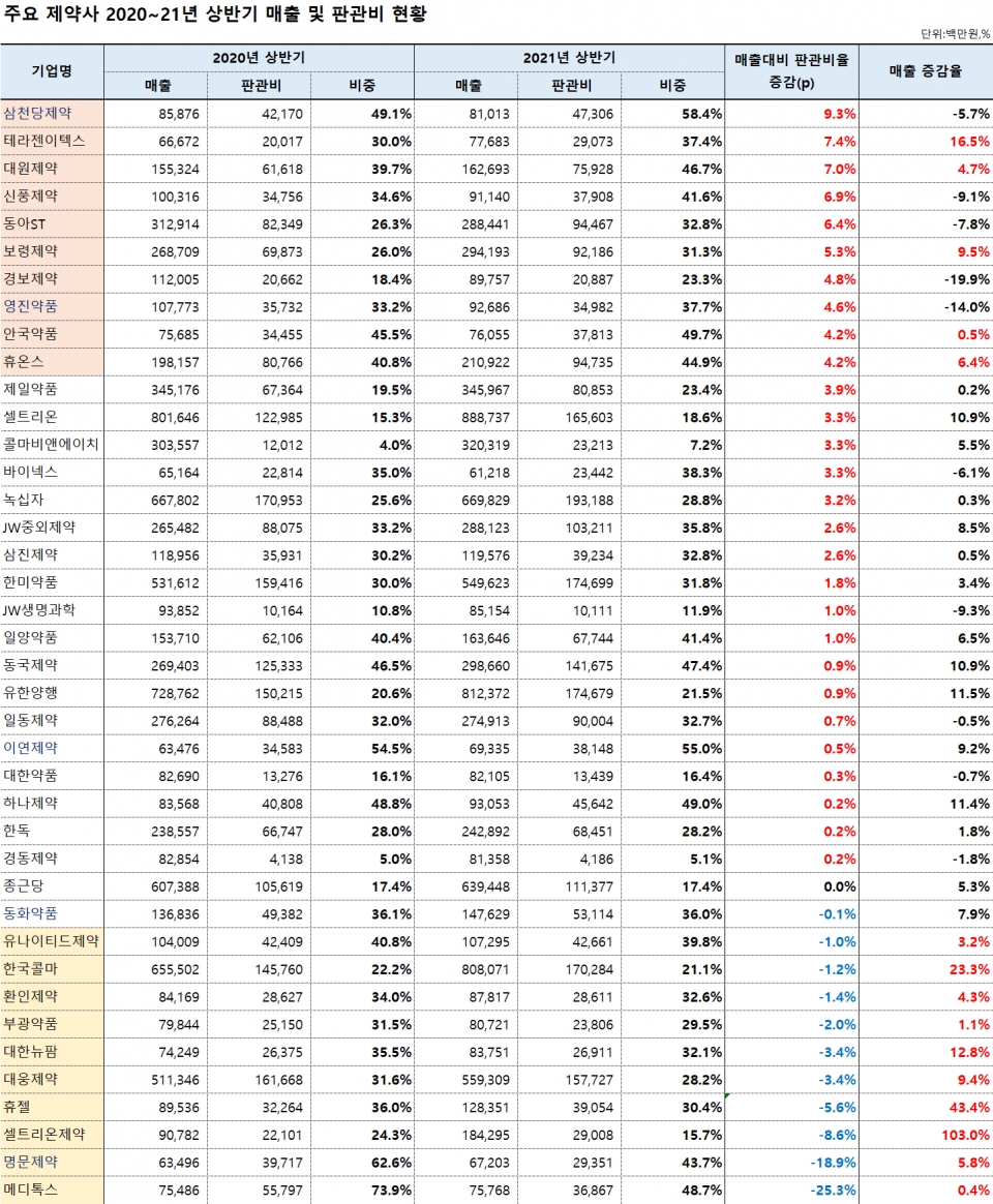 코로나19 여파에도 ‘쩐의 전쟁’은 현재 진행형이다. 주요 제약사들이 올해 상반기에 공격적인 영업활동을 벌인 것으로 나타났다. 대형사뿐 아니라 중견 제약사들의 판관비(영업활동비)가 지난해에 비해 대폭 증가한 것. 그 결과를 전격 공개한다.# 삼천당제약, 테라젠이텍스 판관비율 증가 ‘1위’팜뉴스가 금융공시시스템 자료를 토대로 주요 제약사 40곳의 올해 상반기 판관비와 매출액 추이를 분석한 결과, 먼저 28곳의 매출액 대비 판관비율을 늘어났다. 이중 ‘TOP10’은 삼천당제약 (9.3%↑), 테라젠이텍스 (7.4%↑), 대원제약 (7.