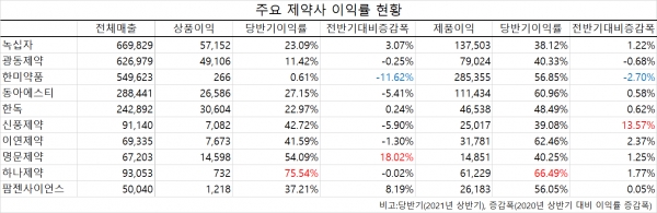 주요 제약사의 ‘알짜 수익’ 희비가 엇갈린 것으로 나타났다. 코로나19 팬데믹 2년차에 접어들면서, 상품과 제품 매출에서 원가를 제외한 알짜 수익 차이가 급격히 벌어진 것. 매출의 실상을 정확히 파악하기 위해 제약사들의 상품과 제품의 이익률을 전격 공개한다.팜뉴스가 27일 전자공시시스템(2021년 반기보고서)을 토대로 GC녹십자 등 주요 제약사 10곳의 상품 매출원가를 분석한 결과, 하나제약의 상반기 이익률이 가장 높은 것으로 나타났다. 제품은 제약사 스스로 생산하는 개념이고 다른 제약사에서 상품을 들여와 판매하는 것이 상품이다.