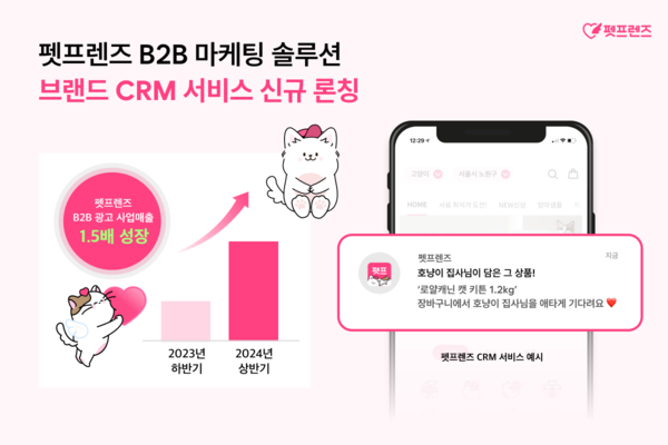 펫프렌즈(대표 윤현신)가 펫커머스 업계 최초로 입점 파트너사를 위한 ‘브랜드 CRM(고객관계관리) 광고 서비스’를 론칭한다고 12일 밝혔다. 지난해부터 입점 파트너사들을 대상으로 한 광고 서비스를 확장하며, 펫커머스 뿐 아니라 B2B 광고 솔루션을 통한 수익 창출로 반려동물 버티컬 커머스의 리더십을 공고히 하게 됐다.펫프렌즈는 지난해 4월부터 입점 파트너사들의 매출 증진을 위해 샘플링 서비스, 데이터 솔루션, 상품 광고 등 다양한 광고 서비스와 데이터 분석 솔루션을 차례로 선보여왔으며 좋은 반응을 얻고 있다. 실제로 올해 상반기 펫