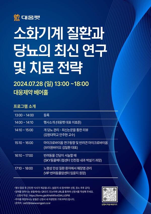 대웅펫(대표 이효준, 문재봉)은 오는 28일 서울 강남구 삼성동 대웅제약 베어홀에서 수의사 및 반려동물 업계 종사자를 대상으로 오프라인 심포지엄인 ‘소화기계 질환과 당뇨의 최신 연구 및 치료 전략’을 개최한다고 15일 밝혔다.이번 심포지엄은 췌장 질환, 마이크로바이옴 뿐만 아니라 간담도계 및 당뇨의 최신 치료 전략에 대한 심도 있는 논의를 위해 마련됐다. 행사는 대웅펫 이효준 대표의 소개말을 시작으로 ▲개 당뇨 관리 - 최신 논문을 통한 리뷰(강원대학교 안주현 교수) ▲마이크로바이옴 연구동향 및 반려견 마이크로바이옴(브이원바이오 김