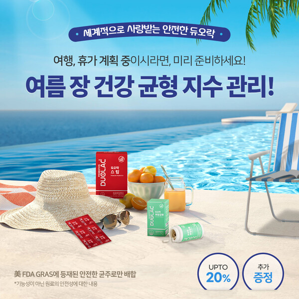 마이크로바이옴 선도 기업 쎌바이오텍의 안전한 유산균 브랜드 ‘듀오락(DUOLAC)’이 본격적인 여름휴가 시즌에 맞춰 ‘여름 장 건강 균형 지수 관리!’ 기획전을 실시한다고 17일 밝혔다. 이번 기획전은 여름휴가 시 물갈이로 인한 배앓이 문제를 예방하고 건강한 여행을 즐기기 위한 아이템으로 ‘듀오락 스탑’과 ‘듀오락 위청장쾌’를 추천하고자 기획됐다.기획전은 7월 30일까지 듀오락 몰에서 진행된다. 여행객들을 위한 유산균 제품으로 ▲물갈이 설사를 대비하기 위한 ‘듀오락 스탑’은 최대 9일분을 추가 증정하며, ▲소화효소가 함유되어 과식을