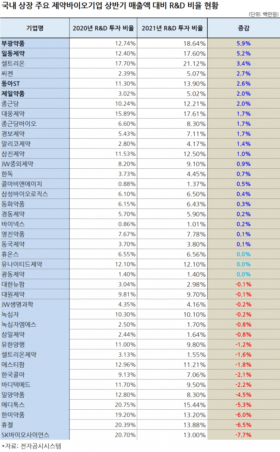 중견 제약사들이 상반기 연구개발 투자(R&D)를 적극적으로 확대한 것으로 나타났다. 대형사에 비해 체급이 작은데도 투자에 나서고 있다. 반면 일부 중소제약사들은 연구개발 투자에 소극적인 것으로 드러났다. 업계에서는 이들이 악재를 뚫기 위해서는 일종의 도약이 필요하다는 관측이 나오고 있다. 팜뉴스가 19일 금융공시를 토대로 제약바이오사 40곳의 R&D 현황을 분석한 결과 부광약품 등 21곳이 전년도 상반기보다 매출액 대비 R&D 투자비율이 늘었다. 휴온스 등 3곳은 변화가 없었고 대한뉴팜 등 16곳은 R&D 투자비율이 줄었다. 주목할