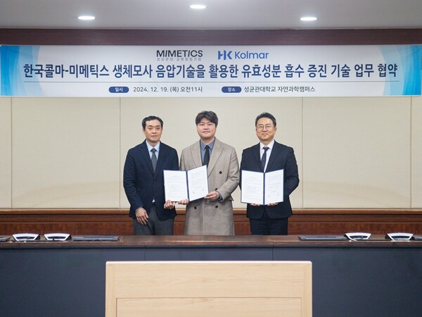 한국콜마가 동·식물 생체모사 스타트업인 미메틱스(MIMETICS)와 손잡고 기능성 유효성분 흡수율을 높이는 화장품을 개발한다.한국콜마는 미메틱스와 ‘생체모사 음압 기술을 활용한 유효성분 흡수 증진 기술 업무협약(MOU)’을 체결했다고 밝혔다. 협약식에는 한상근 한국콜마 기술연구원 부원장과 미메틱스 박형기 대표, 성균관대학교 방창현 교수 겸 미메틱스 CTO(Chief Technology Officer) 등이 참석했다.미메틱스는 문어, 개구리, 달팽이 등 생물의 기능을 모사해 제품을 개발하는 생체모사 연구기업이다. 성균관대 교원 창업기