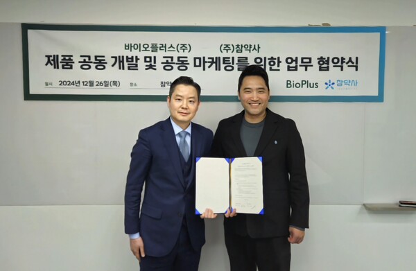 바이오플러스(099430, 대표이사 정현규)가 지난 26일 약국 플랫폼 전문기업 참약사(대표이사 김병주)와 화장품 공동개발 및 마케팅을 위한 양해각서(MOU)를 체결했다고 밝혔다.이번 협약을 통해 양사는 ▲신제품 공동 개발 ▲공동 마케팅 등 다양한 분야에서 협력할 것을 약속했다. 바이오플러스는 독자적인 기술력을 바탕으로 바이오 기술을 활용한 약국 공급용 화장품 및 점안제 개발을 담당한다. 참약사는 전국 약국 프랜차이즈 네트워크를 기반으로 마케팅과 유통을 맡을 예정이다.바이오플러스는 자사의 휴그로펩타이드(HugrPeptide) 기술이