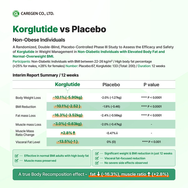 펩타이드 전문 바이오기업 케어젠은 10월 28일 독일 프랑크푸르트에서 열리는 'CPHI Worldwide 2025'에서 자사의 경구용 GLP-1 펩타이드 '코글루타이드(Korglutide)'의 정상 BMI(비비만) 성인 대상 12주 중간 임상 데이터를 공개한다고 밝혔다. '코글루타이드'는 케어젠이 독자 개발한 GLP-1R/IGF-1R 이중 작용 경구 펩타이드로, GLP-1의 식욕 억제 및 체중 감소 효과에 더해 IGF-1 작용을 통해 근육 손실을 최소화하고 근육 성장을 촉진하는 기전을 가진다. 이는 체중 감량 시 근육 손실이 발생하