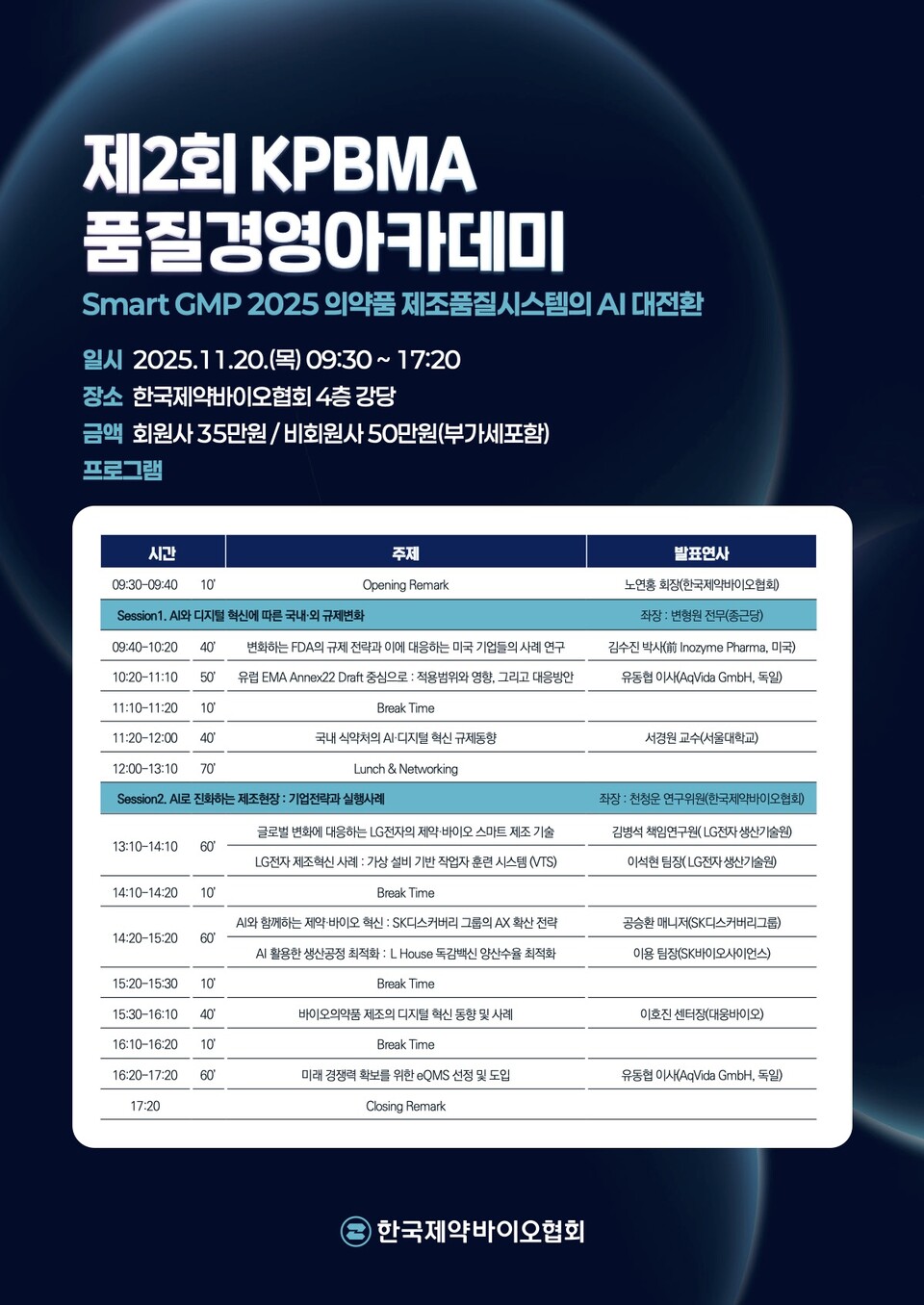 한국제약바이오협회(회장 노연홍)는 오는 11월 20일(목) 협회 4층 강당에서 '제2회 KPBMA 품질경영 아카데미'를 개최한다고 28일 밝혔다. 올해 아카데미는 'Smart GMP 2025: 의약품 제조품질시스템의 AI 대전환'을 주제로 열리며, 제약바이오 업계 종사자들이 참석해 AI, 빅데이터, 로봇 기술을 활용한 규제 및 리스크 관리 교육과 실무 적용 사례를 공유할 예정이다. 이번 아카데미는 제약바이오산업의 디지털 전환이 가속화되는 가운데, 제조 및 품질관리 분야의 규제 대응 역량 강화와 현장 적용 방안을 모색하기 위해 기획됐