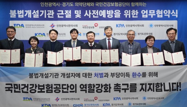 인천광역시약사회(회장 윤종배)는 지난 13일 국민건강보험공단 인천·경기지역본부와 인천광역시·경기도 지역 의약 8개 단체와 함께 '면허 대여 약국 및 사무장병원 등 불법 개설 의료기관 근절과 사전 예방을 위한 업무협약'을 체결했다고 밝혔다.이번 협약에는 인천광역시약사회, 치과의사회, 한의사회, 간호사회, 경기도약사회, 치과의사회, 한의사회, 간호사회 등 8개 단체가 참여했다.협약의 주요 내용은 ▲국민 건강 증진과 건전한 의료환경 조성을 위한 상시 협력체계 구축 ▲면허 대여 약국 및 사무장병원 등 불법 개설 기관에 대한 행정조사 공조