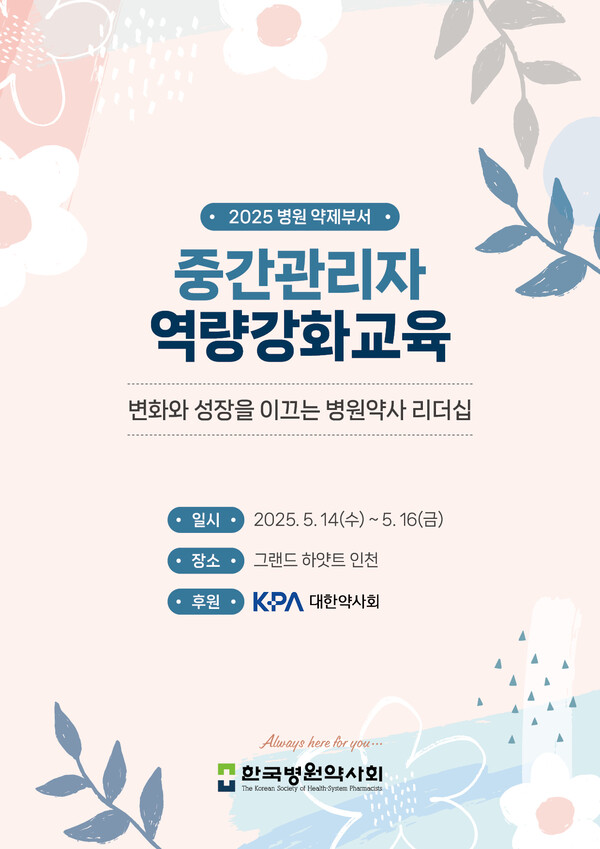 한국병원약사회(회장 정경주, 이하 병원약사회)는 5월 14일(수)부터 16일(금)까지 2박 3일간 그랜드 하얏트 인천에서 ‘변화와 성장을 이끄는 병원약사 리더십’을 주제로, ‘2025 병원 약제부서 중간관리자 역량강화교육’을 개최한다.본 역량강화교육은 변화하는 보건의료 환경에서 중간관리자로서 보다 능동적이고 효율적으로 업무를 수행할 수 있는 능력 배양 및 자질 함양을 위하여 마련된 교육으로 매년 2박 3일 일정으로 개최해오고 있다.첫째 날인 5월 14일(수)에는 정경주 회장의 개회사를 시작으로 휴베이스 모연화 부사장의 ‘약사 리더십