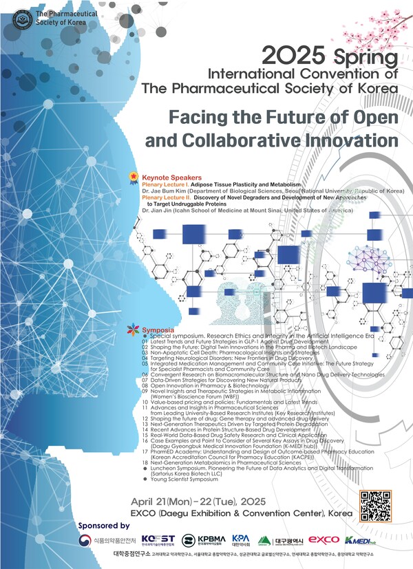 대한약학회(회장 김형식)는 21일부터 22일까지 양일간 대구엑스코에서 “Facing the Future of Open and Collaborative Innovation”을 주제로 2025 대한약학회 춘계국제학술대회를 개최한다.제54대 집행부의 첫 번째 학술대회인 이번 학술대회는 ‘세대·지역·전공 간의 균형발전’, ‘최신 동향과 미래의 요구에 부응’, ‘지속 가능한 정책을 통한 미래로의 도약’이라는 3대 중점 추진 방향에 따라 기획됐으며, 기조강연, 다양한 주제의 심포지엄, 연구윤리 교육 세션, 포스터 발표 등 프로그램으로 구성됐다