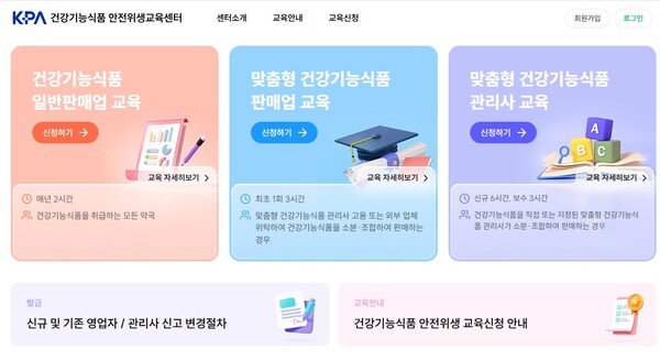 대한약사회(회장 권영희, 이하 약사회)는 22일, 온라인 교육 사이트인 ‘대한약사회 건강기능식품 안전위생교육센터’(이하 교육센터)를 오픈하고 지난 18일부터 운영중에 있다고 밝혔다.약사회가 식품의약품안전처로부터 건강기능식품 안전위생교육기관으로 지정됨에 따라 구축한 교육센터에서는 ▲건강기능식품 일반판매업교육 ▲맞춤형 건기식 판매업 교육 ▲맞춤형 건기식 관리사 신규∙보수교육을 받을 수 있다.회원신고를 완료한 약사회원의 경우 수강료는 무료이며 약사회 통합 홈페이지 아이디/패스워드를 통해 로그인 할수 있다. 올해 정기교육 운영기간은 오는