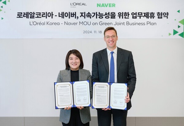 로레알코리아가 지난 18일 네이버와 지속가능성을 위한 업무제휴협약(Green Joint Business Plan)을 체결했다고 밝혔다.이번 협약은 양사의 환경 및 사회적 책임을 강화하여 지속 가능한 방식의 사업 활동을 지원하고 환경적 영향을 검토 및 감축하는 것을 목표로 한다. 서울 삼성동 로레알코리아 사옥에서 진행된 이날 협약식에는 사무엘 뒤 리테일 로레알코리아 대표, 채선주 네이버 대외/ESG 정책 대표 등 주요 관계자들이 참석했다.양사는 이번 협약을 기반으로 공동계획을 수립해 양사의 직간접적 환경적 영향과 더불어 환경 및 사회