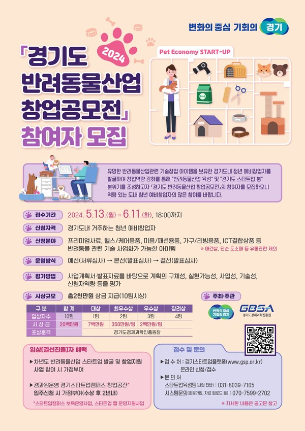 경기도는 급변하는 반려동물산업 창업문화 확산을 위해 혁신적인 아이디어와 기술을 가진 유망 예비 창업자를 발굴하는 ‘경기도 반려동물산업 창업공모전’에 참가할 도내 청년 예비 창업자를 오는 6월 11일까지 모집한다.올해 처음으로 시행하는 경기도 반려동물산업 창업공모전은 펫푸드, 펫헬스케어, 펫테크 분야 사업화 아이템(아이디어·기술·제품)을 보유한 예비 창업자를 육성·지원하기 위한 것이다. 참가 자격은 분야별 창의적인 아이디어를 가진 경기도 내 청년(19세~39세) 예비창업자다.예선(서류심사)과 본선 발표심사를 거처 10월 개최되는 결선