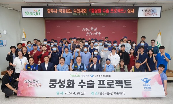 국경없는수의사회가 지난달 28일 경기 양주시와 함께 양주시농업기술센터에서 ‘중성화 수술 프로젝트’를 진행했다고 2일 밝혔다.국경없는수의사회와 양주시는 지난 2021년 6월 양주시 동물보호 등을 위한 업무협약(MOU)을 맺은 바 있다. 이번이 두 번째 진행하는 중성화 수술 프로젝트다.이날 행사에는 강수현 양주시장을 비롯해 김화은 양주시농업기술센터 소장, 김재영 국경없는수의사회 대표, 이승철 국경없는수의사회 사무국장, 자원봉사 수의사 및 수의대생 등 100여 명이 참석한 가운데 ▲인사말 ▲임명장 수여 ▲감사패 수여 ▲중성화 수술 진행