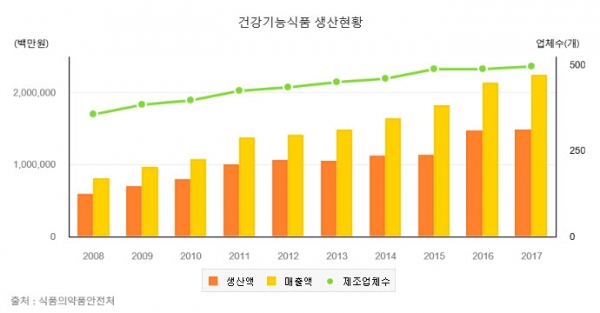 ‘건강기능식품’은 결핍되기 쉬운 영양소 또는 인체에 유용한 기능을 가진 원료나 성분(이하 기능성원료)을 사용해 제조한 식품으로 건강을 유지하는데 도움을 주는 제품이다. 이는 현대인의 건강에 대한 관심이 점차 높아지면서 시장 규모도 커지고 있는 추세다.실제로 건기식의 최근 3년간 시장규모를 보면 2015년 생산액 1조 1,332억 원, 판매액 1조 8,230억 원에서 2016년 생산액 1조 4,715억 원, 판매액 2조 1,260억 원, 지난해 생산액 1조 4,819억 원, 판매익 2조 2,374억 원으로 꾸준히 증가하고 있다.상황이