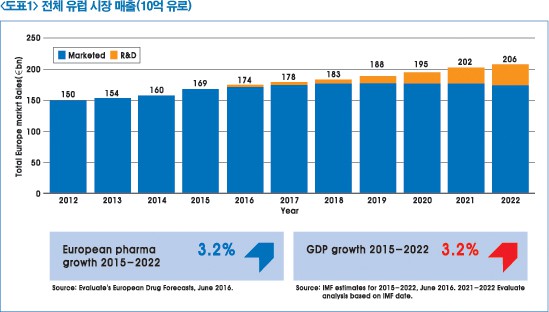 유럽의 제약산업이 2022년까지 지속적인 성장(2015-2022 연평균성장률 3.2%)을 보일 것으로 예상됨에 따라 새로운 잠재성을 지닌 블록버스터 신약의 출현이 예견되고 있다. 종양학이 성장 측면에서 가장 많은 부분을 차지하고 있지만, 혁신신약은 몇몇 치료 분야에 걸쳐 등장하고 있다. 2022년에 가장 많이 판매될 ‘톱10’ 제품 중에서 톱이 휴미라(Humira)에서 자렐토(Xarelto)로 바뀔 것으로 예측되고 있으며 5가지 치료제는 암 분야에서 미충족 요구를 다루게 될 것으로 보인다. 제약업계의 파이프라인이 결과 개선에 대한
