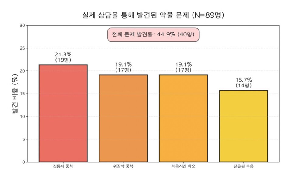 서울시약사회(회장 김위학) 약료사업위원회(부회장 우경아·본부장 장진미·위원장 유우리)는 지난 10월 26일 서울광장에서 열린 건강서울페스티벌에서 진행한 '약, 많을수록 헷갈리시죠?(다제약물 관리사업)' 홍보부스 및 상담부스 운영 결과와 시민 설문조사 결과를 발표했다. 이번 설문은 시민들의 약물 복용 실태와 다제약물 관리에 대한 인식을 파악하기 위해 진행됐으며, 총 515명이 참여했다. 그 결과 시민의 44.9%가 진통제, 위장약 중복 복용, 복용 오류, 오용 등 약물 복용에 문제가 있는 것으로 나타났다. 이는 약물 안전관리를 위한