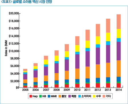 [창간특집2 : 제약산업의 미래 바이오의약품 2.0] 5. 글로벌 백신시장 현황 및 전망 2009년 221억 달러 → 2014년 350억 달러 글로벌 정보제공업체 은 소아용 예방백신 R&D의 진전과 매출 증가로 글로벌 예방백신 시장이 향후 4년에 걸쳐 성장을 지속할 것으로 전망했다. 지난 2009년 기준 글로벌 예방백신 시장은 221억 달러로 추산되며, 오는 2014년에는 350억 달러의 시장을 형성할 것으로 나타났다.(CAGR : 9.7%) 이번 보고서는 소아용 백신의 매출이 성인용 백신의