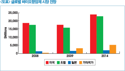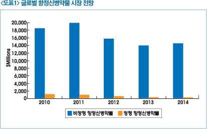 [창간특집2 : 제약산업의 미래 바이오의약품 2.0] 3. 주요 치료약물 시장 전망대형품목 제너릭 공세로 시장 축소그동안 시장의 성장을 주도했던 블록버스터 합성의약품의 특허만료와 함께 주요 치료영역의 시장규모가 축소될 전망이다. 시장조사 전문업체 는 글로벌 항정신병약물 시장과 심혈관질환 치료제 시장이 향후 5년에 걸쳐 마이너스 성장을 지속할 것으로 전망했다. 보고서에 따르면 오는 2014년 글로벌 항정신병약물 시장은 148억 달러를 기록, 187억 달러를 기록한 지난 2009년에 비해 크게 축소될 것으로 나