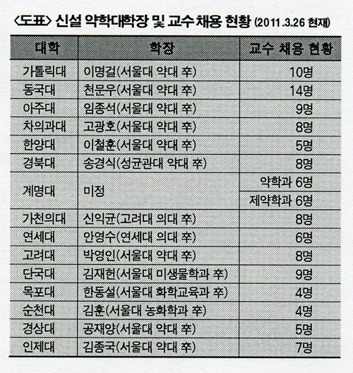 [창간특집2 :제약산업의 미래 약학교육] - 신설 약대 현황 및 역할론 지난해 2월 26일 교육과학기술부는 2011학년도 약대 신설을 신청한 32개 대학을 대상으로 서면평가 및 현장실사 등을 거쳐 총 15개 대학을 신설 약대로 선정했다고 발표했다. 이를 통해 350명의 정원이 15개 대학에 배분됨에 따라 각 대학들은 적게는 20명에서 많게는 25명의 정원을 확보하는 데 그쳤다. 하지만 발표 당시 대학별 실제 약대의 운영 및 투자계획 이행 점검 절차를 거쳐 신설 약대에 배정된 정원을 2012학년도부터 최소한의 적정 규모가 되도록 추가