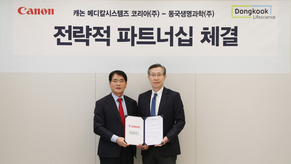 조영제 전문 기업 동국생명과학(대표이사 박재원)은 캐논 메디칼시스템즈 코리아㈜(대표이사 김영준)와 국내 의료 영상 진단 장비 판매 및 서비스를 위한 전략적 파트너십을 체결했다고 20일 밝혔다.이번 협약으로 동국생명과학은 캐논 메디칼시스템즈 코리아가 판매하는 Canon 사의 MRI, CT, 초음파 등 주요 영상 진단 장비의 공식 파트너로서, 전국 의료기관을 대상으로 장비 공급부터 설치, 기술 지원, 유지보수 등 전반적인 서비스를 담당하게 된다.캐논 메디칼시스템즈 코리아는 AI 영상 재구성 기술, 저선량 촬영기술, 미세혈류 영상기술 등