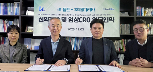 임상시험 전문기업 ㈜움트(대표이사 신남철)와 인공지능(AI) 신약개발 전문기업 ㈜메디리타(대표이사 배영우)가 천연물의약품 개발을 위한 업무협약(MOU)을 체결했다. 이번 협약은 메디리타의 인공지능 기술과 움트의 임상시험 운영 노하우를 결합해 신약개발 전 과정을 효율화하기 위한 것이다.움트 본사에서 열린 협약식에는 신남철 대표와 배영우 대표를 비롯한 양사 주요 관계자가 참석했다. 두 회사는 CRO 용역을 기반으로 신약후보물질 발굴, 검토, 분석, 전략 수립을 공동으로 추진하고, 천연물 유래 후보물질의 분자구조 분석과 물성 예측 등 개