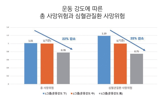 그림 1. 운동강도에 따른 비후성심근증 환자의 총 사망위험과 심혈관질환 사망위험운동강도가 높을수록 사망 위험이 낮다.