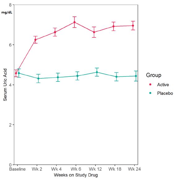 분석결과, 위약 투여군에서는 평균 4.58md/dL에서 4.43md/dL로 변화가 거의 없던 것에 비해, 시험약을 투여한 군에서는 혈중 요산 농도가 평균 4.57md/dL에서 6.96md/dL로 유의미하게 증가했다. 연구의 1차 평가 지표 중 하나인 중대이상반응의 경우 시험군 30명 중 6명, 위약군 25명 중 4명이 발생해 양 그룹 간 차이가 없었고 다른 특이사항은 발견되지 않아 안정성 문제는 없었다.