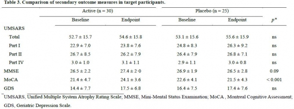 또한 연구팀은 시험약 투여군에서 환자의 인지 상태 평가가 개선되는 것을 2차 평가 지표 분석을 통해 확인했다. 환자의 인지 상태를 평가하는 Mini-Mental Status Examination(이하 MMSE)와 Montreal Cognitive Assessment(이하 MoCA) 검사에서 시험약 투여군의 경우 MMSE 26.5±2.2→27.4±2.0, MoCA 21.4±4.7→24.1±3.6로 위약 투여군 평가 결과인 MMSE, 26.9±1.9→26.5±2.8, MoCA, 22.6±4.1→21.5±4.3 보다 유의미한 개선을 보였다. 두 지표 모두 일관적으로 의미있는 차이를 보였고, MMSE보다 MoCA에서 더 큰 호전을 보인다는 점에서 인지저하 패턴을 잘 반영한 것으로 볼 수 있다.