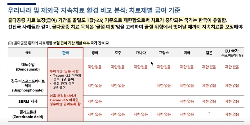골다공증 치료 기준을 제한하고 치료를 중단하는 국가는 우리 밖에 없다. 미국, 일본, 독일, 이탈리아, 프랑스, 호주, 영국 등은 골절 예방에 목적을 두고 지속 치료를 보장하고 있다. 미국내분비학회(Endocrin society) 경우 티스코어 -2.5 이하 진단을 받은 환자는 골다공증 위험군으로 분류하고 지속 치료와 관리를 권고한다.