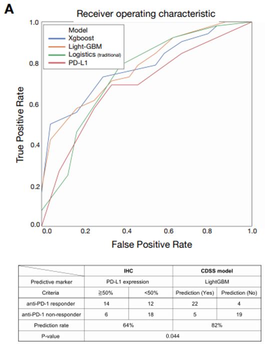 그 결과, 연구팀은 대상자들의 기존 PD-L1 발현율 이외에 나이, 성별, 종양크기, 전이된 위치, 일반혈액검사 수치 등 총 19가지의 비침습성 임상 데이터를 기반으로 비소세포폐암 환자의 면역항암제 치료반응을 예측할 수 있는 알고리즘을 개발했다.