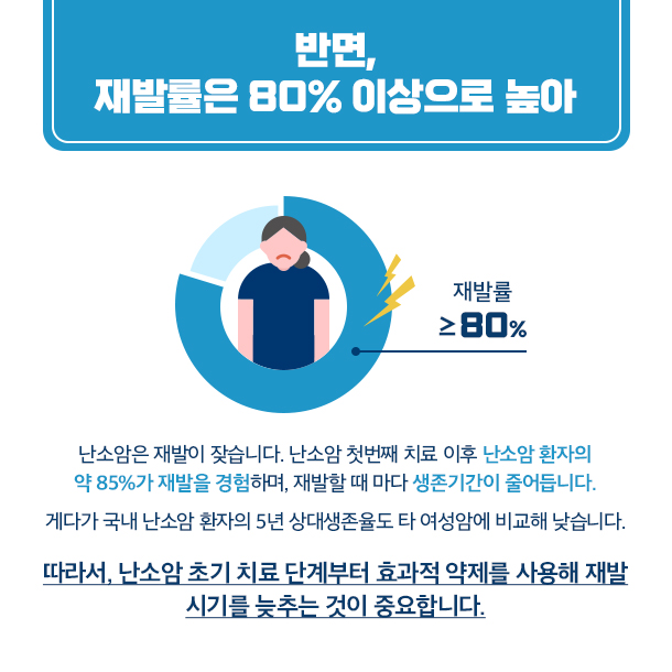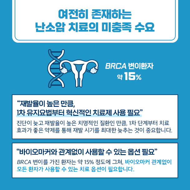 난소암은 재발이 잦다. 난소암 첫번째 치료 이후 난소암 환자의 약 85%가 재발을 경험하며, 재발할 때 마다 생존기간이 줄어든다. 게다가 국내 난소암 환자의 5년 상대생존율도 타 여성암에 비교해 낮다. 중앙암등록본부가 2020년에 발표한 자료를 보면, 난소암 5년 상대생존율은 65.2%로 타 여성암인 유방암의 5년 상대생존율인 93.3% 대비 낮은 생존율을 보였다. 따라서, 난소암 초기 치료 단계부터 효과적 약제를 사용해 재발 시기를 늦추는 것이 중요하다.