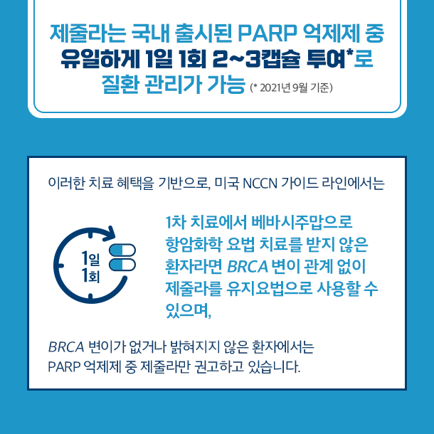 제줄라는 국내 출시된 PARP 억제제 중 유일하게 1일 1회 2~3캡슐 투여로 질환 관리가 가능하다. 이러한 치료 혜택을 기반으로, 미국 NCCN 가이드라인에서는 1차 치료에서 베바시주맙으로 항암화학요법 치료를 받지 않은 환자라면 BRCA 변이 관계없이 제줄라를 유지요법으로 사용할 수 있으며, BRCA 변이가 없거나 밝혀지지 않은 환자에서는 PARP 억제제 중 제줄라만 권고하고 있다.
