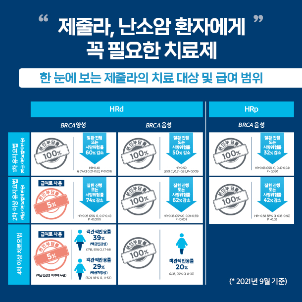 또한, 현재 ▲2차 이상의 백금기반요법에 반응(부분 또는 완전반응)한 백금민감성 재발성 BRCA 변이 고도 장액성 난소암, 난관암, 일차 복막암 환자의 유지요법과 ▲4차 이상 BRCA 변이 재발성 고도 장액성 난소암, 난관암, 일차 복막암 환자의 치료요법에서 급여 처방이 가능하다.