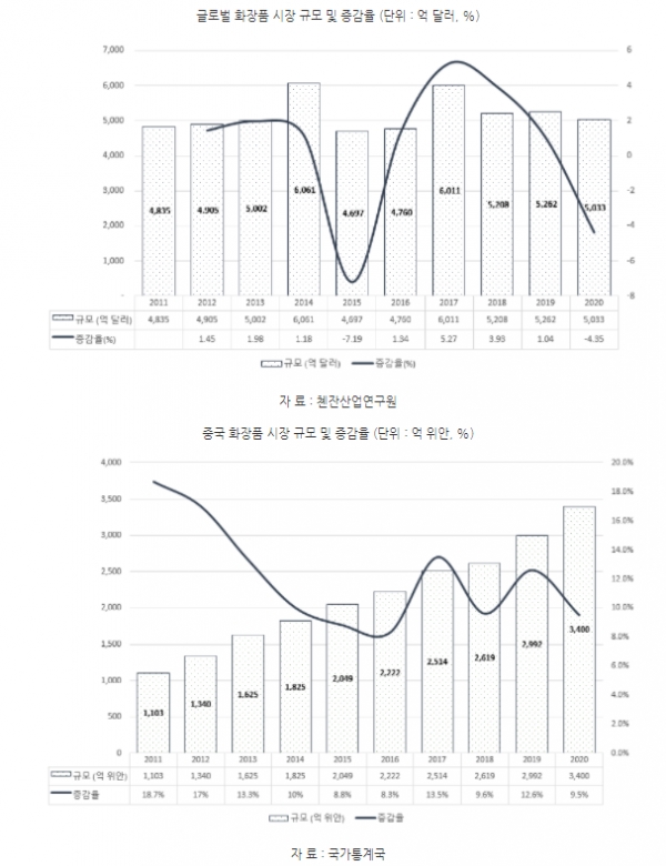 중국의 화장품 산업은 최근 몇 년 동안 급속한 성장세를 보여왔으며 2020년 코로나19 상황에도 불구하고 중국의 화장품 시장은 가장 빠른 시장 회복세를 보였다. 특히 기능성 제품 고객 수요 증가에 따라 수많은 브랜드 제품이 시장에 출시됐다.