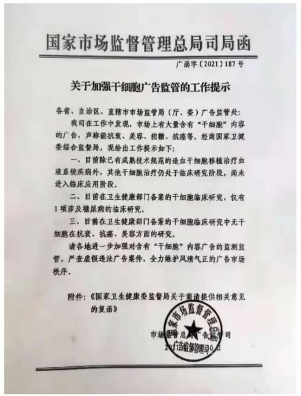 중국시장관리감독총국이 ‘줄기세포 광고 증가에 대한 관리 감독 업무 지시’ 서한을 각성·자치구·직할시 시장감독관리국(청, 위원회)광고 감독관리처에 보내며 줄기세포 관련 허위 위법 광고를 조사하고 광고시장 질서를 바로잡는다고 밝힌 것도 이와 같은 맥락이다.