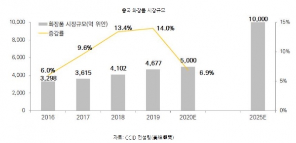 중국 공업정보화부 산하 싱크탱크인 CCID 컨설팅(賽迪顧問)는 중국 화장품 시장규모가 2020년 5천억 위안을 돌파했을 것으로 보고 있다. 2025년까지 이러한 고성장세는 유지될 것이며 2025년 시장규모가 1조 위안 돌파할 것으로 전망했다.