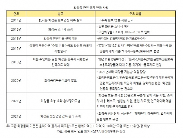 KOTRA 중국 베이징무역관에 따르면중국은 ‘화장품감독조례’ 등 법규를 근거로 화장품원료, 배합, 위생안전, 라벨, 홍보⸱광고 등 생산부터 유통에 이르기까지 전 과정에 대해 관리, 감독을 진행하고 있다.