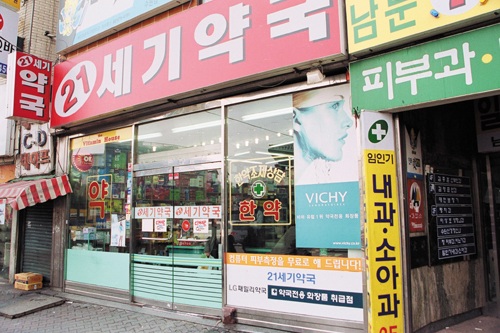 의약분업이 전면 시행되고 약국들이 병원의 영향을 받을 수 밖에 없게 되었다. 이런 영향 탓인지 약국 한켠에 위치한 화장품 코너를 마련한 것도 주변에 피부과가 많기 때문이다. 약국이 있는 건물에만 피부과가 4개가 있고 그 중 전국에서 유명하다는 피부과도 있다.