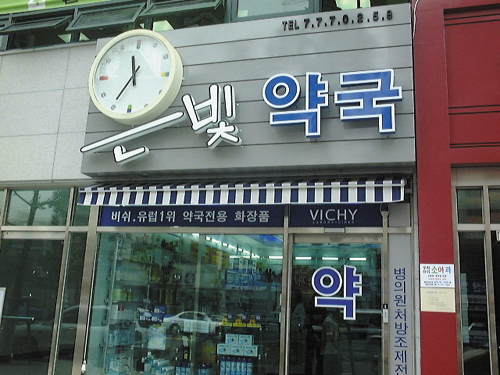 은빛약국은 먼저 간판부터가 눈에 들어온다. 은빛의 은자가 시계모양이다. 그리고 다른 글자들도 약국하면 떠오르는 고딕체의 글자가 아니다. 또한 약이라는 대표색깔인 빨란 색이 아닌 깔끔한 하얀색과 파란 색이 어우러져 있다.