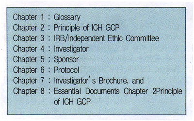 ICH GCP는 다음의 8개의 chapter로 구성되어 있다.
