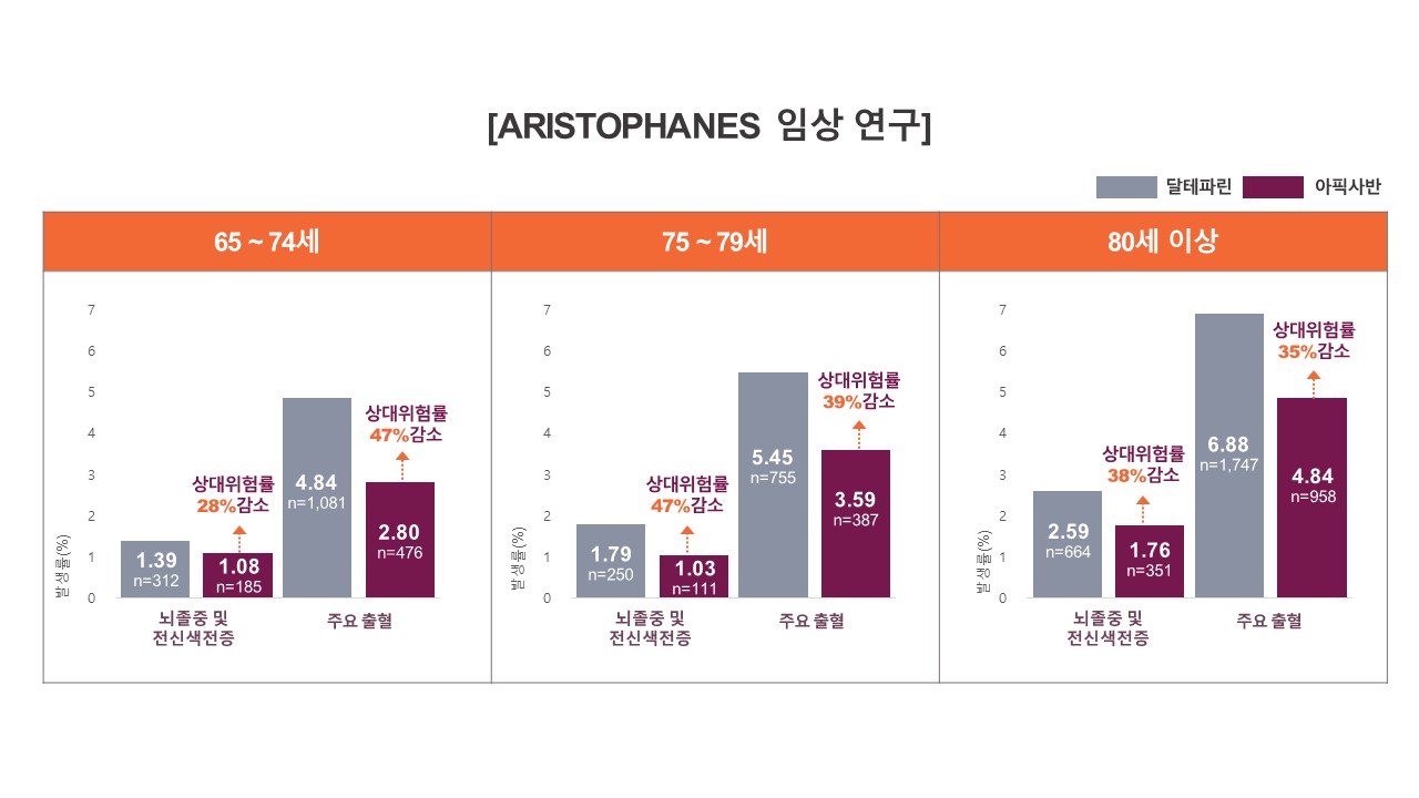 임상 결과는 RWD에서도 일관됐다. 미국에서 비판막성 심방세동 환자를 대상으로 진행한 대규모 RWD 연구 'ARISTOPHANES' 연령별 하위그룹 분석 결과, 아픽사반 투여군은 65~74세, 75~79세, 80세 이상 환자 그룹 모두 뇌졸중, 전신색전증, 주요 출혈 발생 비율이 와파린 투여군 대비 낮게 나타났다.