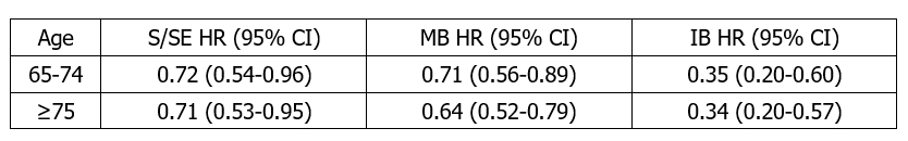 ARISTOTLE 임상 데이터의 연령별 하위 분석을 보면 엘리퀴스는 65~74세, 75세 이상 환자군에서 뇌졸중, 전신색전증 위험(S/SE), 주요 출혈 위험(MB), 두개내출혈 위험(IB) 모두 와파린 대비 감소 시켰다.