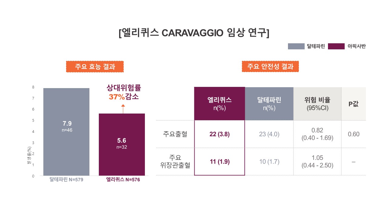 허가사항 변경 근거가 된 임상은 'CARAVAGGIO(3상)' 연구다. 해당 연구는 암 동반 심부정맥 혈전증(DVT) 또는 폐색전증(PE) 환자 대상으로 엘리퀴스와 저분자 헤파린인 프라그민(달테파린)을 비교 분석했다. 그 결과 엘리퀴스는 주요 출혈과 주요 위장관 출혈 위험을 증가시키지 않으면서 VTE 재발 예방 효과를 확인했다(HR: 0.63, 95% CI: 0.37-1.07; p<0.001 for noninferiority, p=0.09 for superiority).