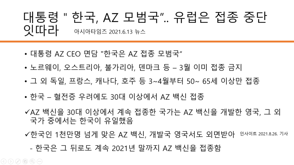 한국은 거꾸로 움직였다. 2021년 6월 우리나라의 대통령은 아스트라제네카 CEO를 면담하면서 "한국은 AZ 백신 접종 모범국"이라고 말했다.