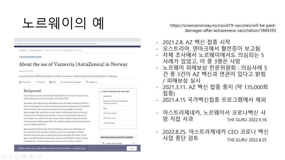 2021년 2월 8일, 노르웨이는 우리나라와 비슷한 시기에 AZ 백신 접종을 시작했다. 하지만 오스트리아, 덴마크에서 이상 반응으로 혈전증이 보고되자 자체 조사를 시작했다.